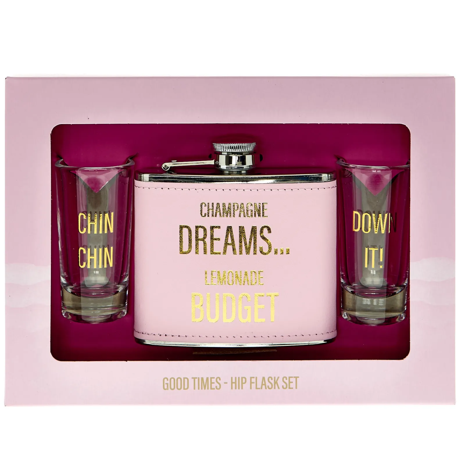 Card Factory Champagne Dreams Lemonade Budget Hip Flask & Shot Glasses