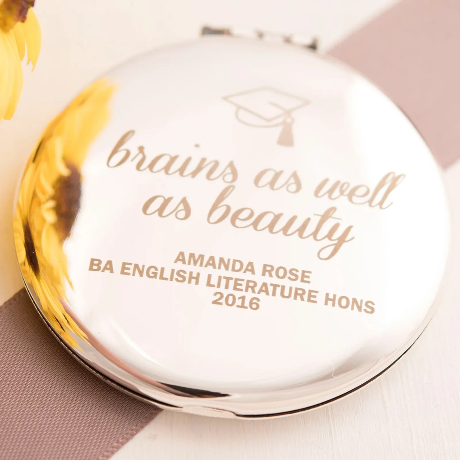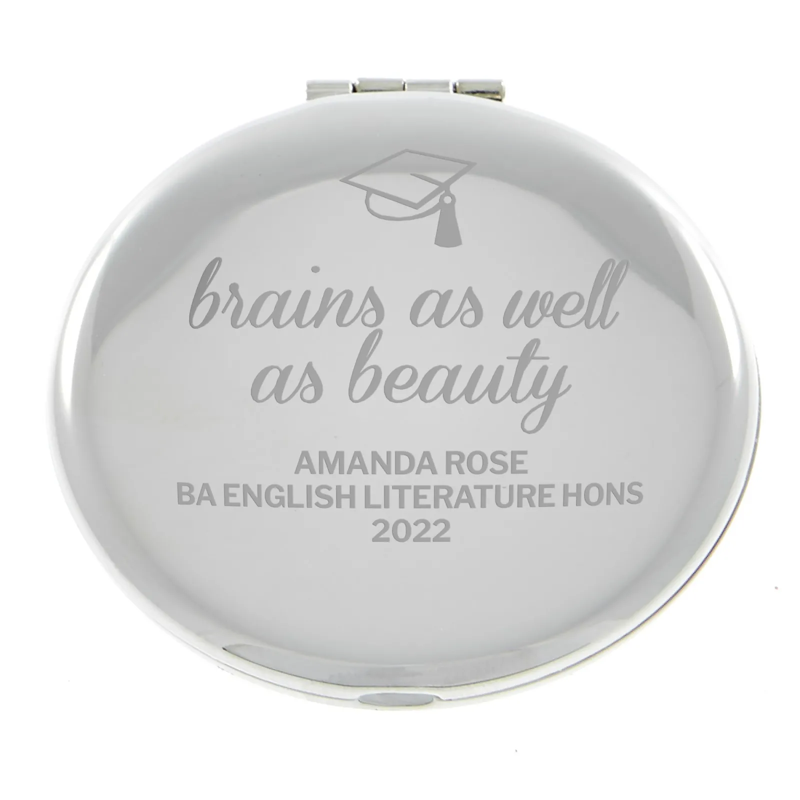 Card Factory Personalised Engraved Silver Round Compact Mirror – Brains & Beauty