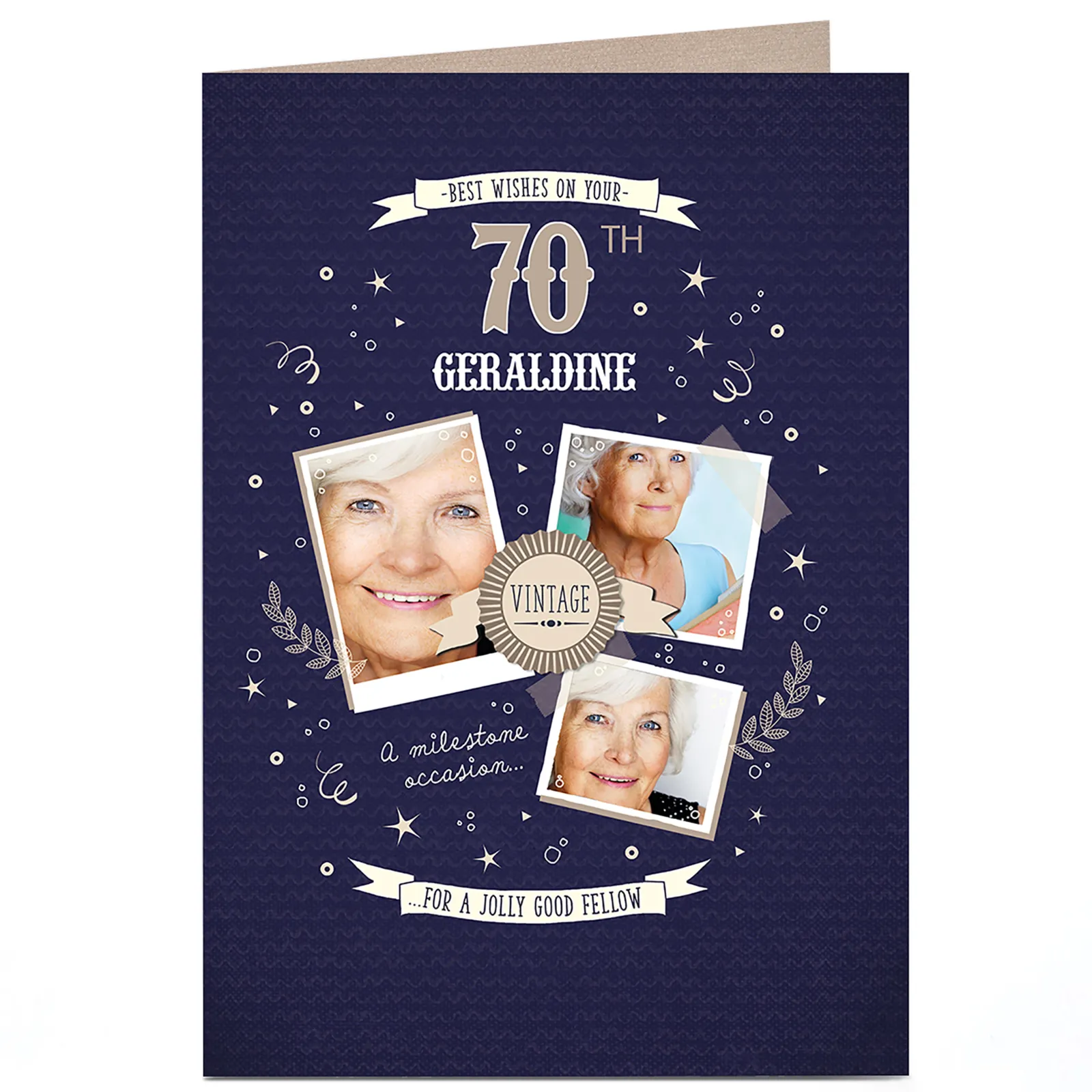 Card Factory Photo Birthday Card – Vintage Blue & Gold, Editable Age