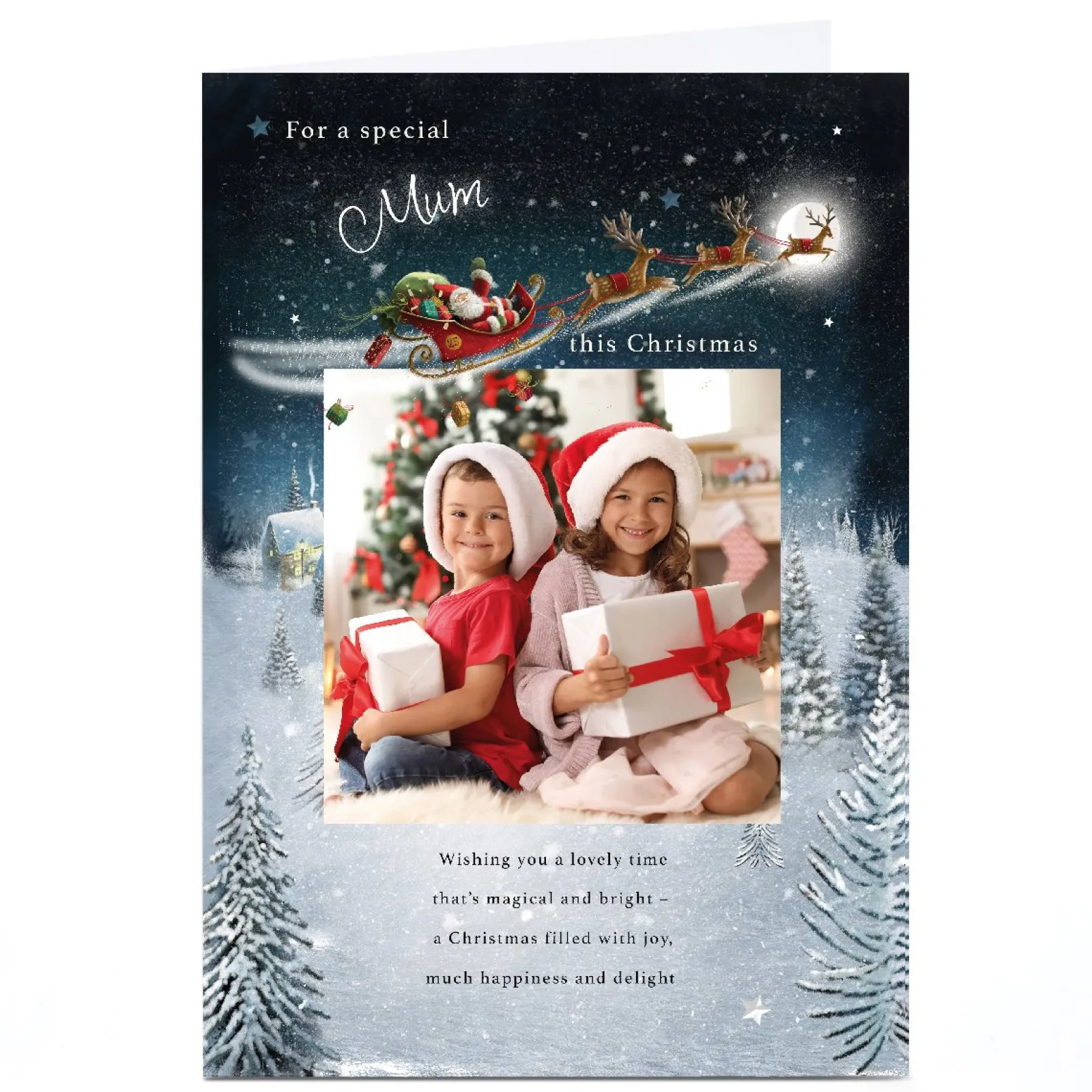 Card Factory Photo Christmas Card – Santa’s Sleigh over Snowy Town, Mum
