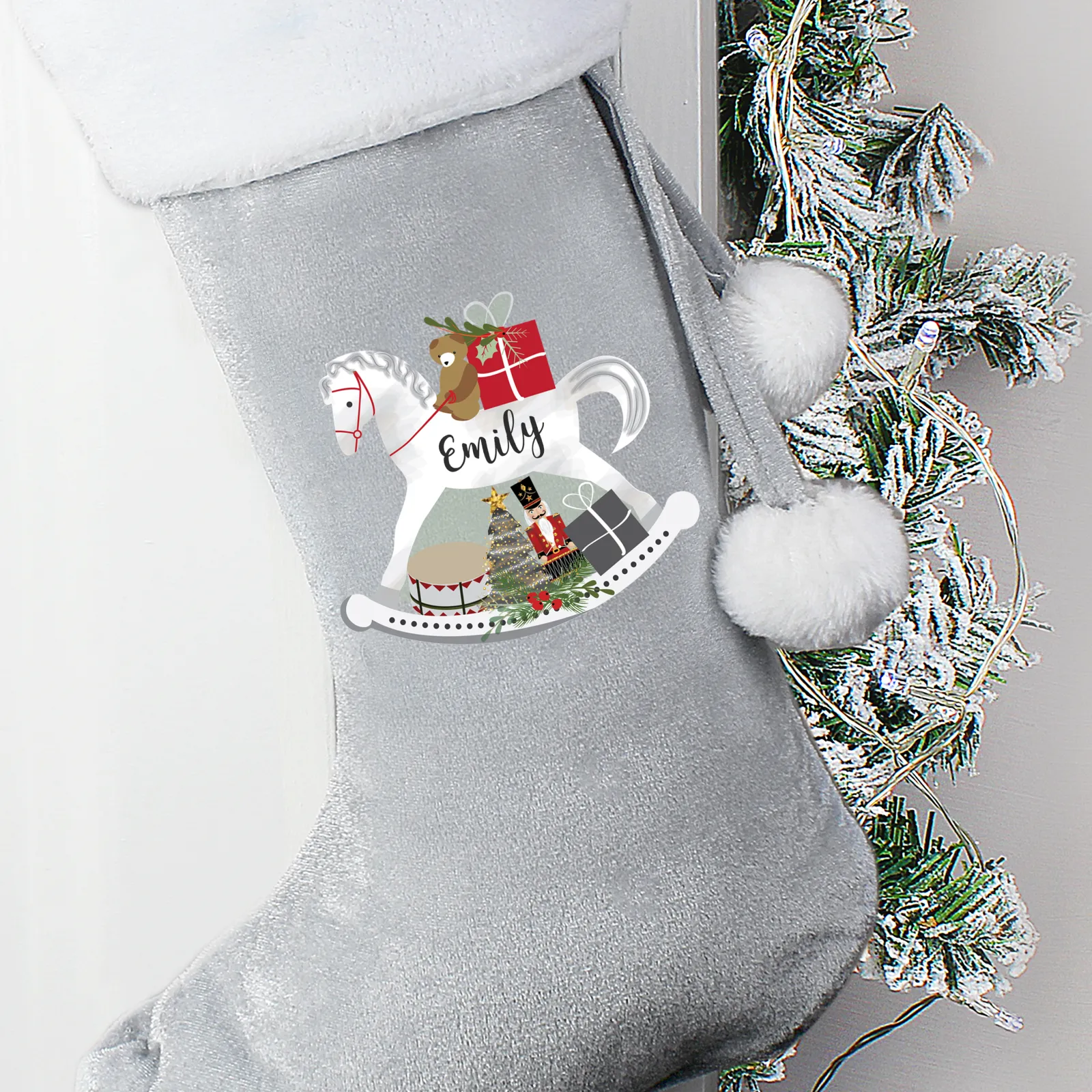 Kids Card Factory Personalised Rocking Horse Luxury Silver Christmas Stocking