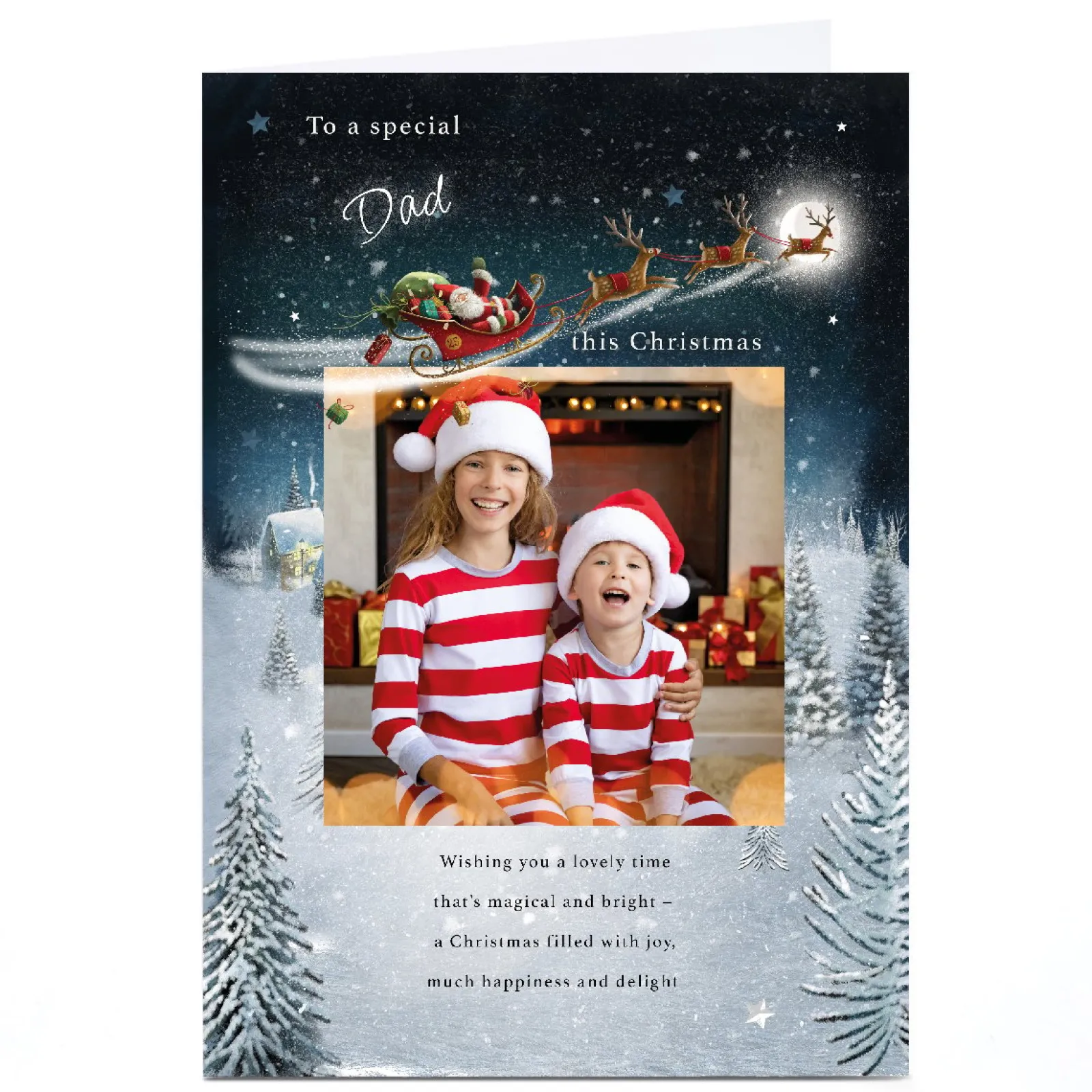 New Photo Christmas Card – Santa’s Sleigh over Snowy Town, Dad Christmas|Photo