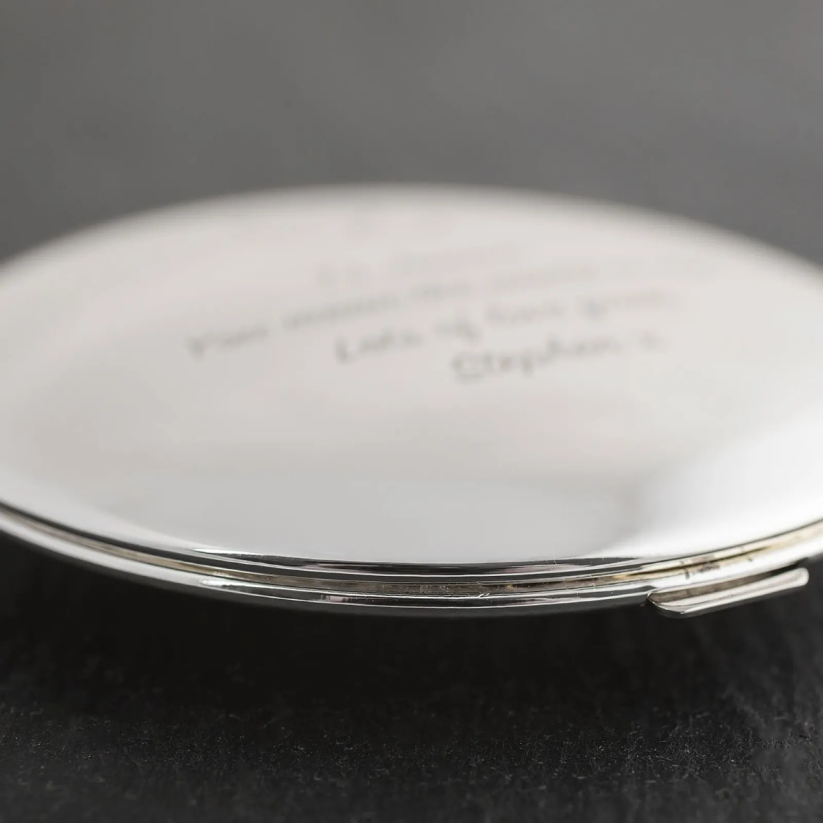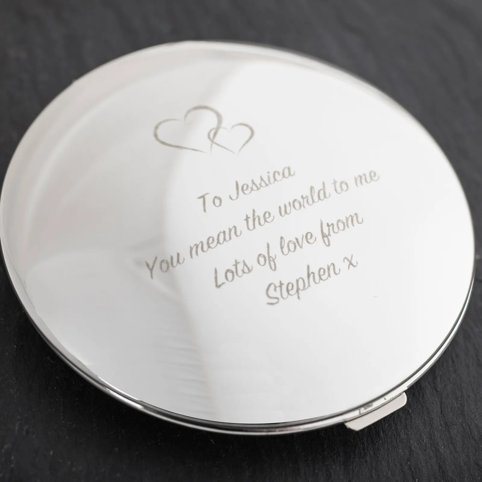 Personalised Engraved Silver Round Compact Mirror – Hearts, Any Message Personalised Jewellery And Keepsakes|Personalised Engraved Gifts