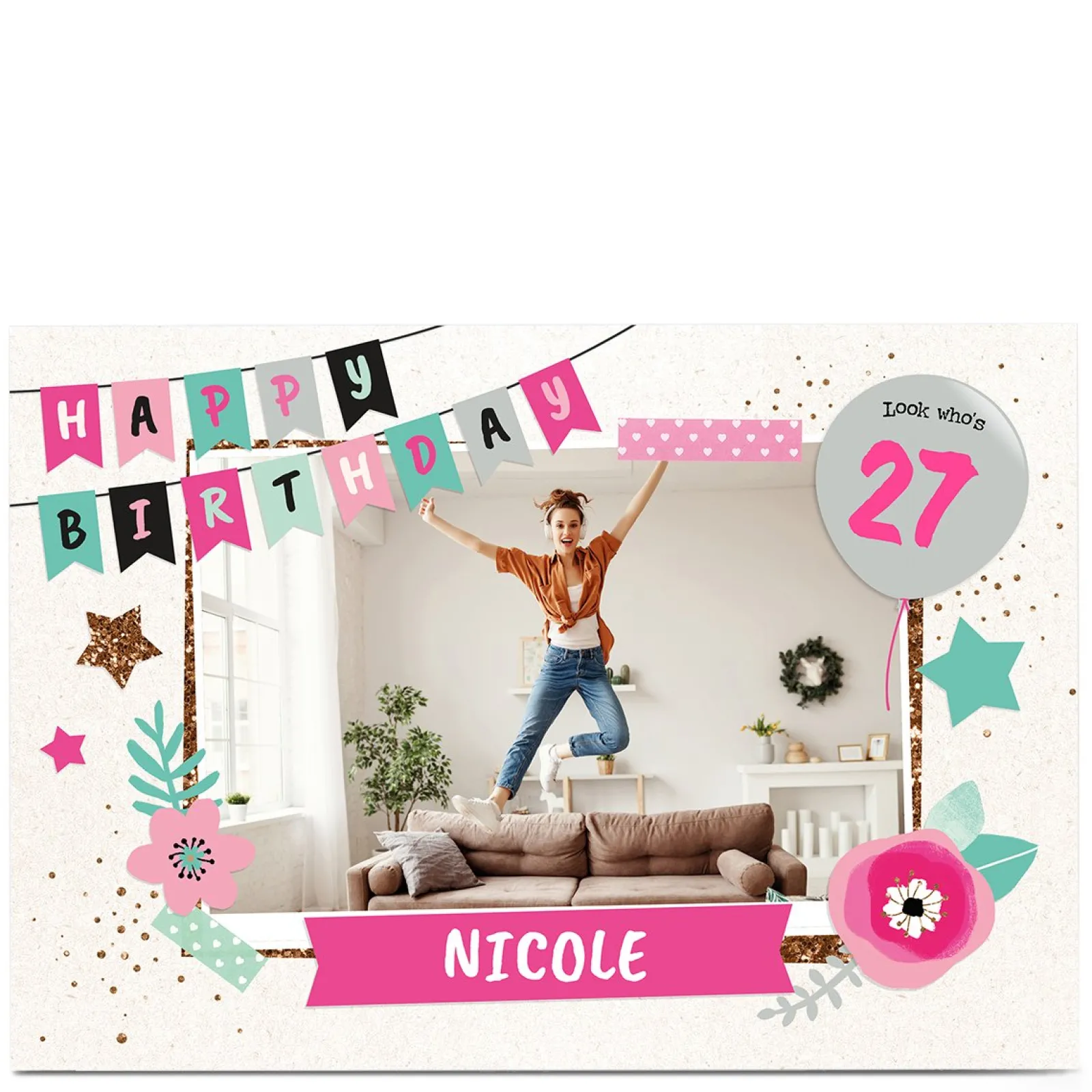 Photo Birthday Card – Flowers & Bunting, Editable Age For Daughter|Daughter