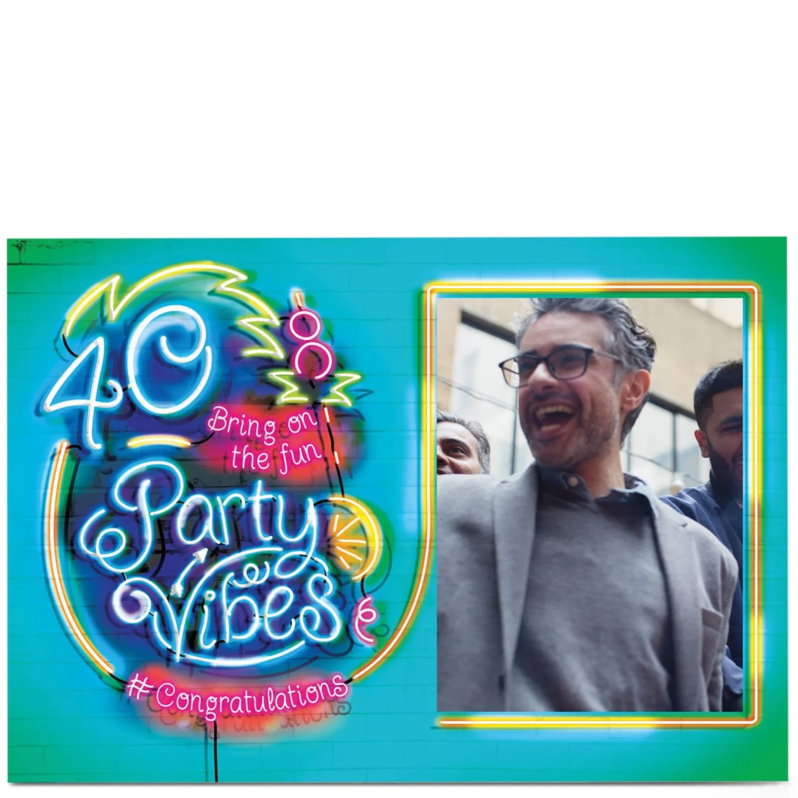 BOY Card Factory Photo 40th Birthday Card – Party Vibes, Neon Lights
