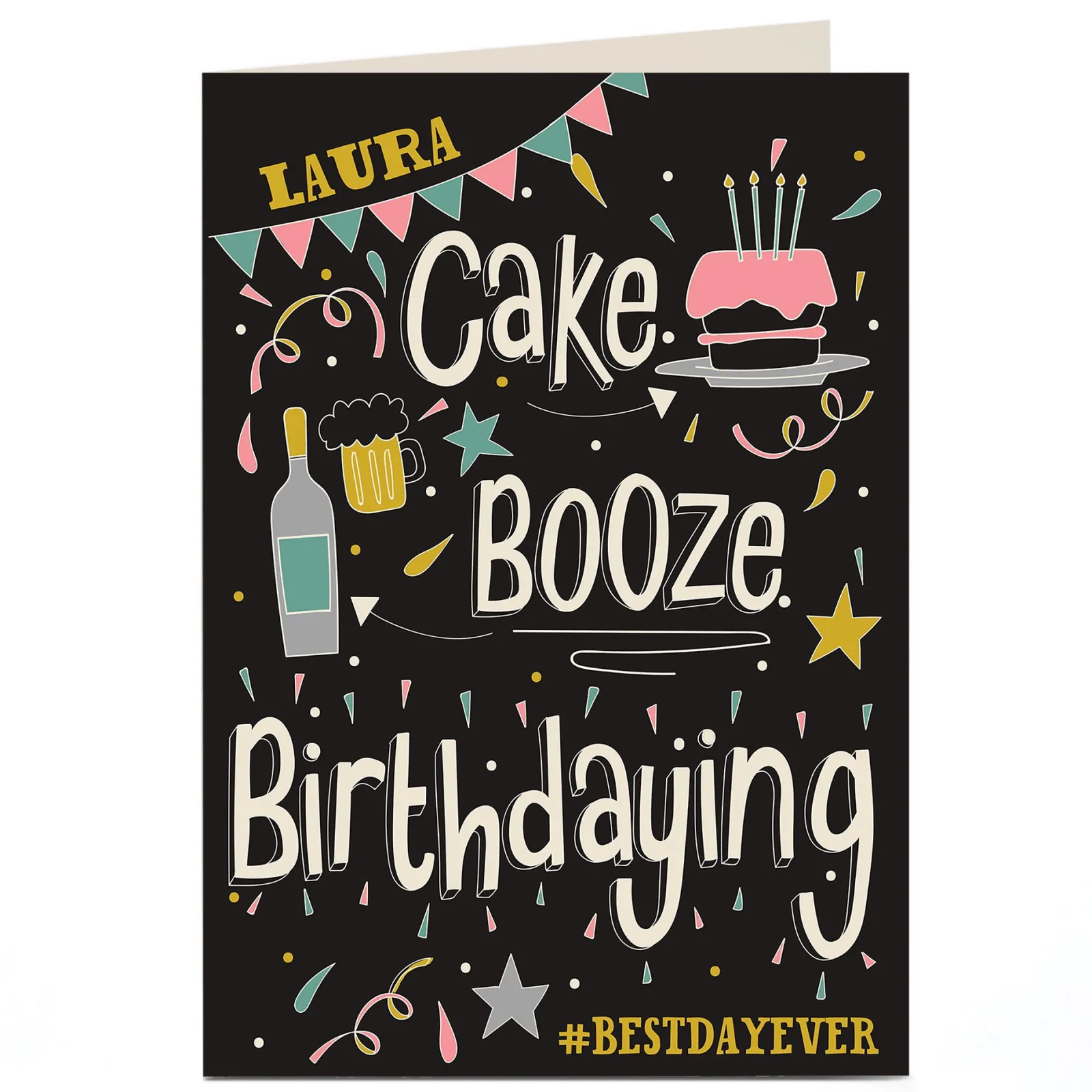 Card Factory Personalised Birthday Card – Cake, Booze, Birthdaying