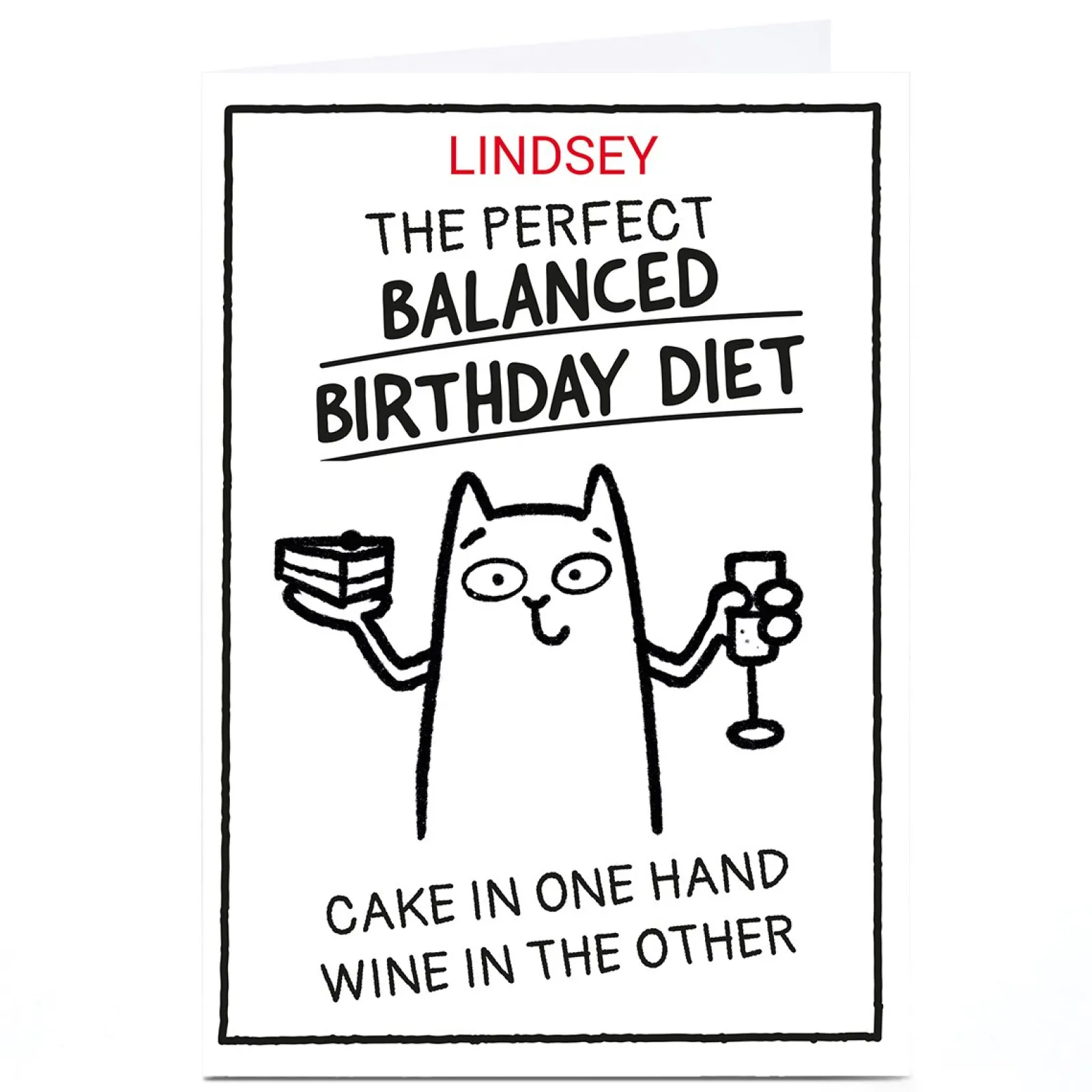 Card Factory Personalised Scrawls Birthday Card – Balanced Cake & Wine