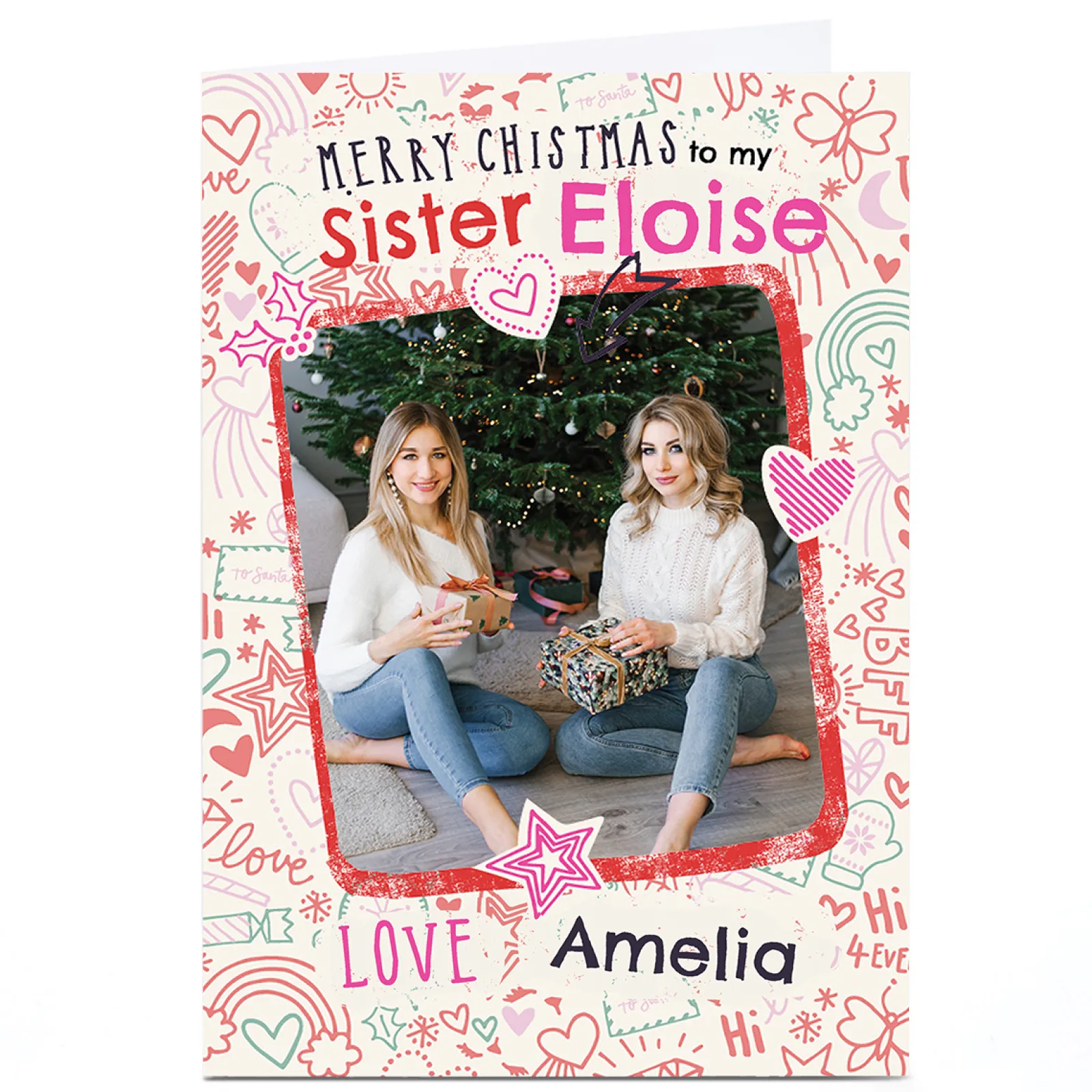 Card Factory Photo Bev Hopwood Christmas Card – Festive Doodles and Hearts, Sister