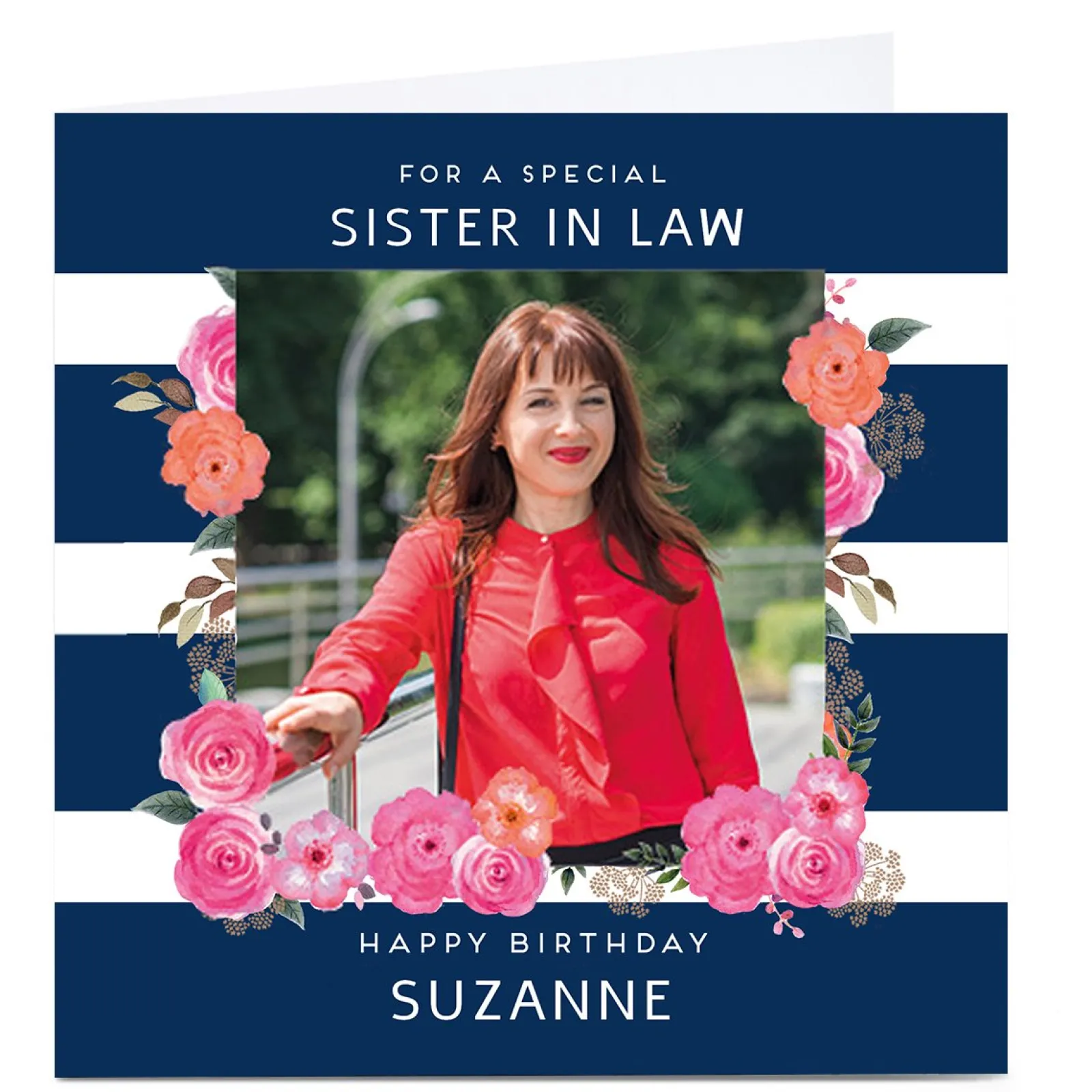 Card Factory Photo Birthday Card – Stripes & Flowers