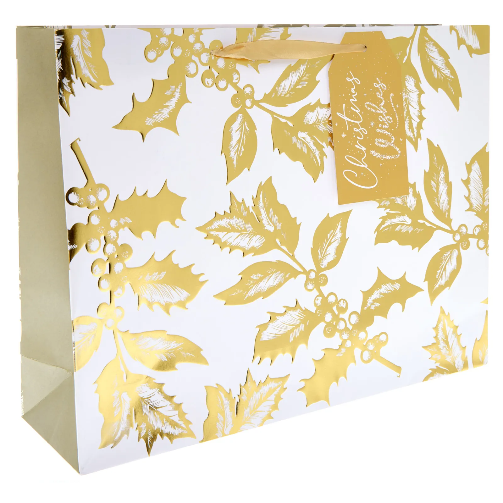 Card Factory White & Gold Holly Extra Large Landscape Christmas Gift Bag