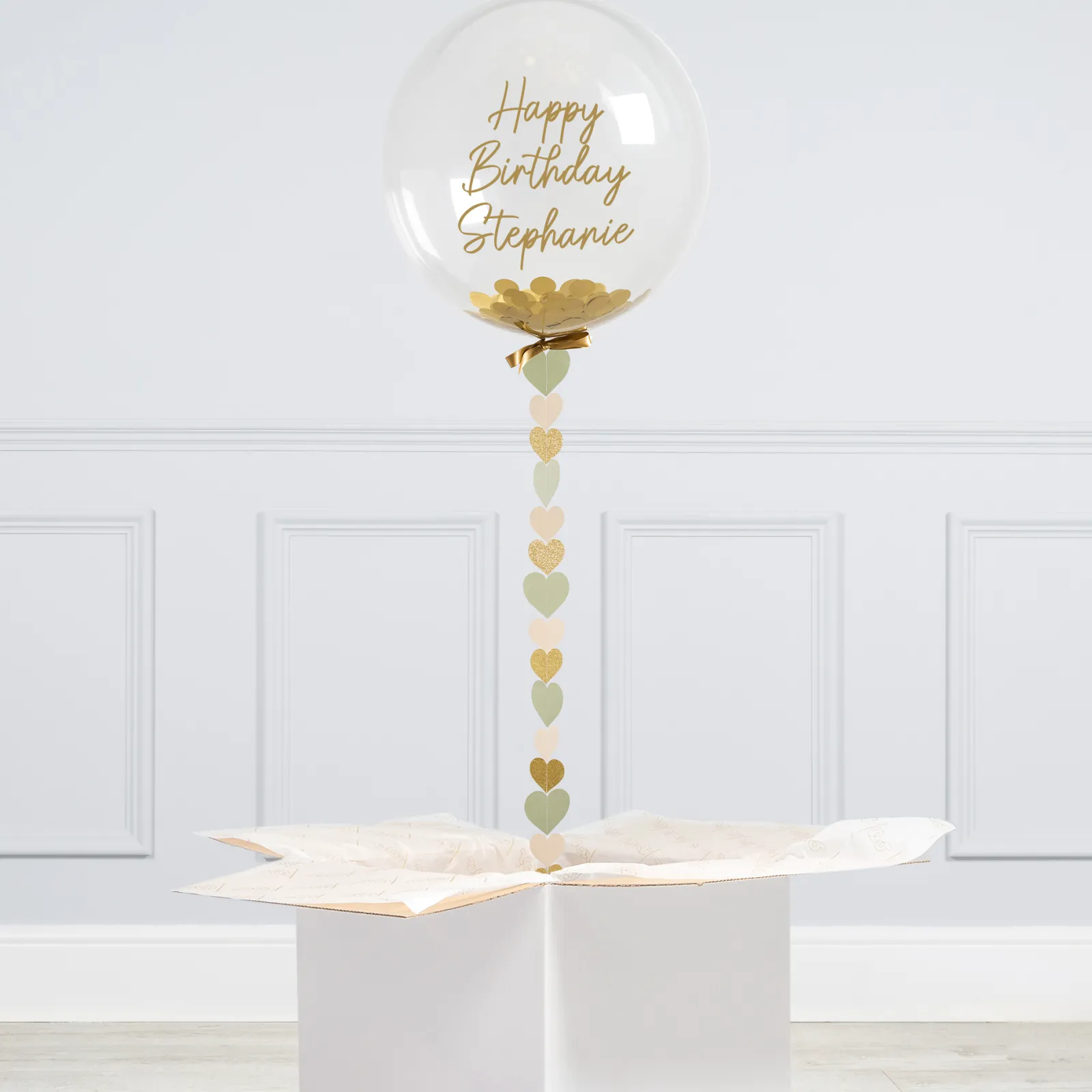 Clearance Personalised 20-Inch Bubblegum Confetti Balloon With Sage Hearts – DELIVERED INFLATED! Personalised Party|Wedding Party