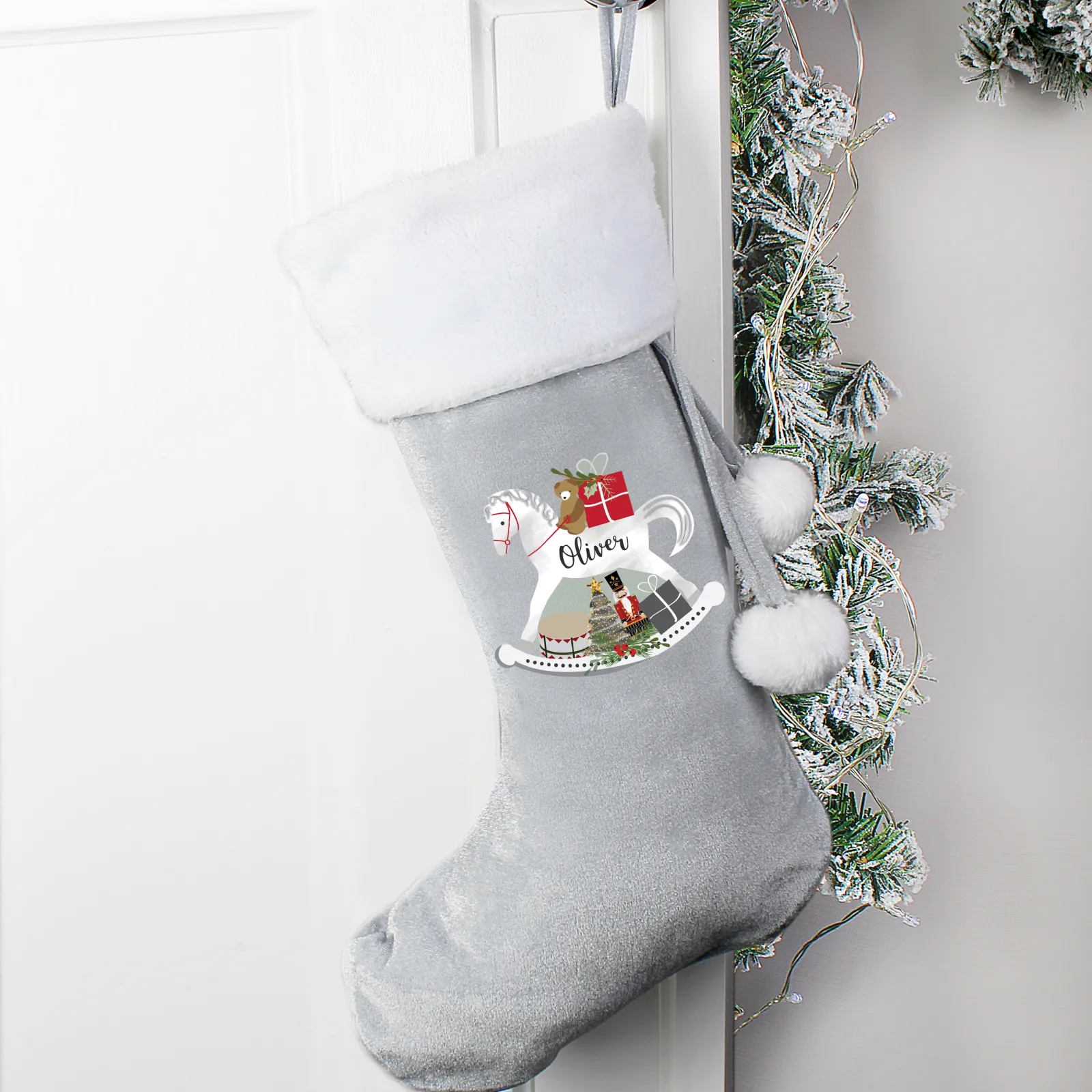 Kids Card Factory Personalised Rocking Horse Luxury Silver Christmas Stocking