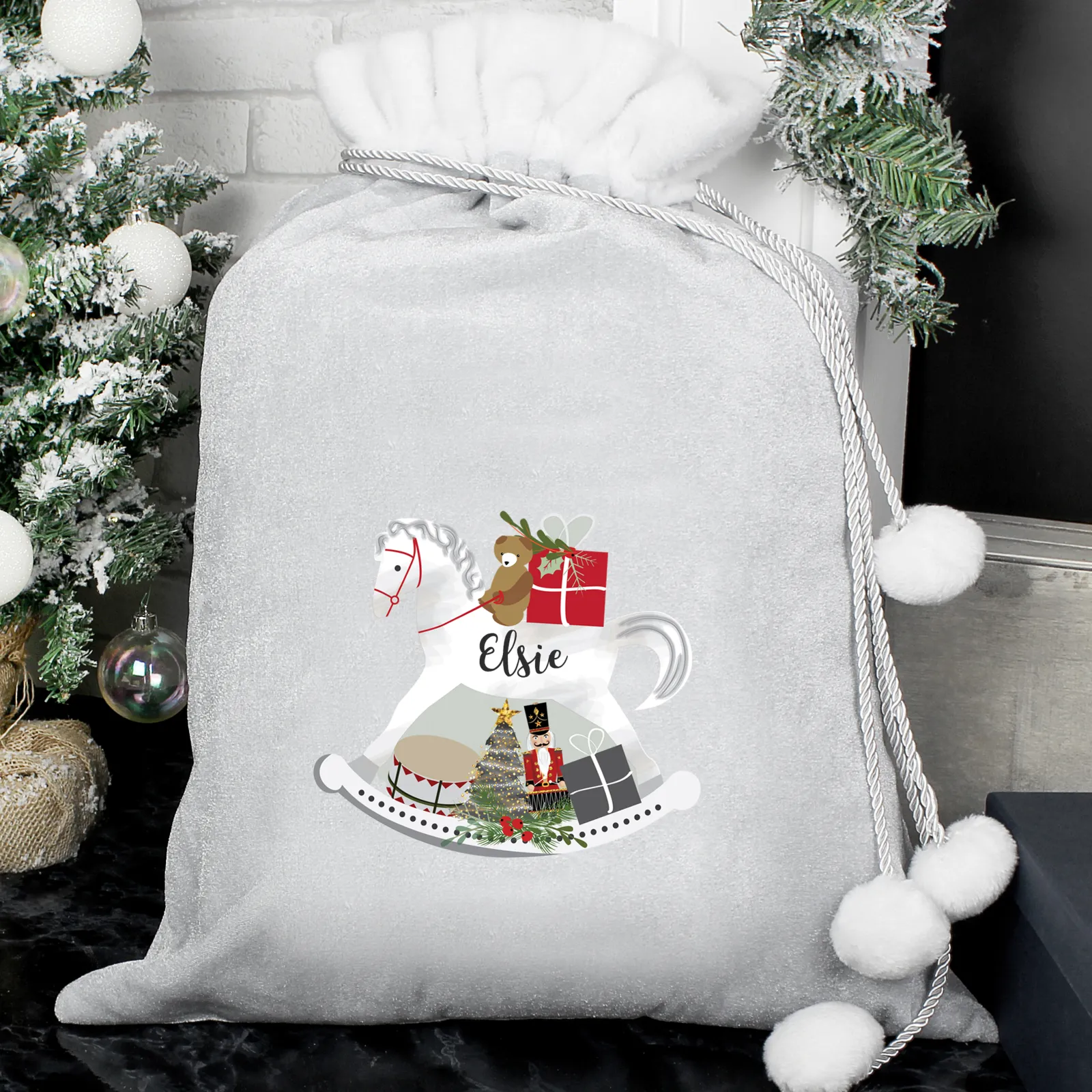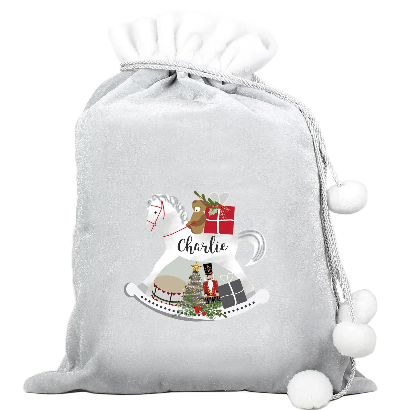 Kids Card Factory Personalised Silver Rocking Horse Pom-Pom Christmas Sack